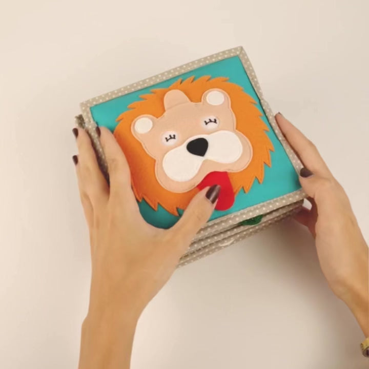Le Mini Quiet Book Lion Rêveur invite les enfants à toucher, découvrir et s’émerveiller. Autour du lion endormi, des scènes riches en détails et de joyeux compagnons les attendent : une grenouille aux membres articulés, une baleine avec son poisson, une poule avec son œuf et bien d’autres surprises.
